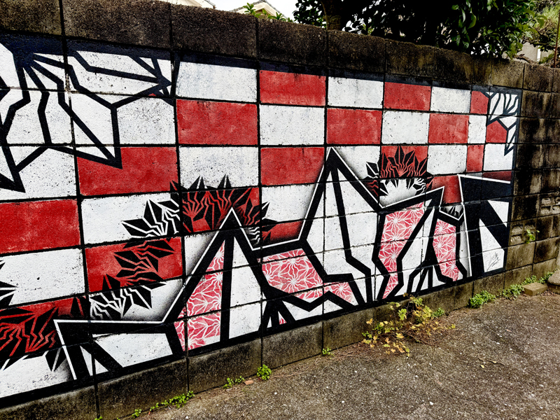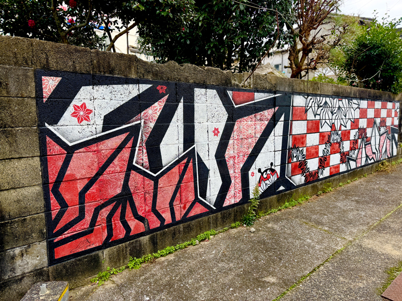 都通りに細い路地への入り口がある。奥へ進むと赤提灯の連なる長いブロッグ塀が現れる。和醸良酒とりごえの隠れ家的スペース「うらごえ」だ。オリジナルの創作和食と美味い酒が存分に楽しめるとりごえのバックストリートには、日本を代表する大阪のライブぺインター「BAKIBAKI」氏にペイントを依頼した。BAKIBAKI氏独自の紋様、通称「BAKI柄」がよく似合うと思ったのだ。大中小のBAKI柄に鮮やかな赤が映える幅8メートルの壁画は夜の裏通りを明るく照らし、にぎやかな祭りの雰囲気を醸す。市民の毎週末の盛り場とりごえにマッチしたアートだといえるだろう。オーナーのとりごえさんとBAKIBAKIさんもすごく仲良くなってくれて良かった、本当に良かった。