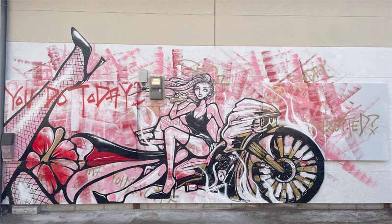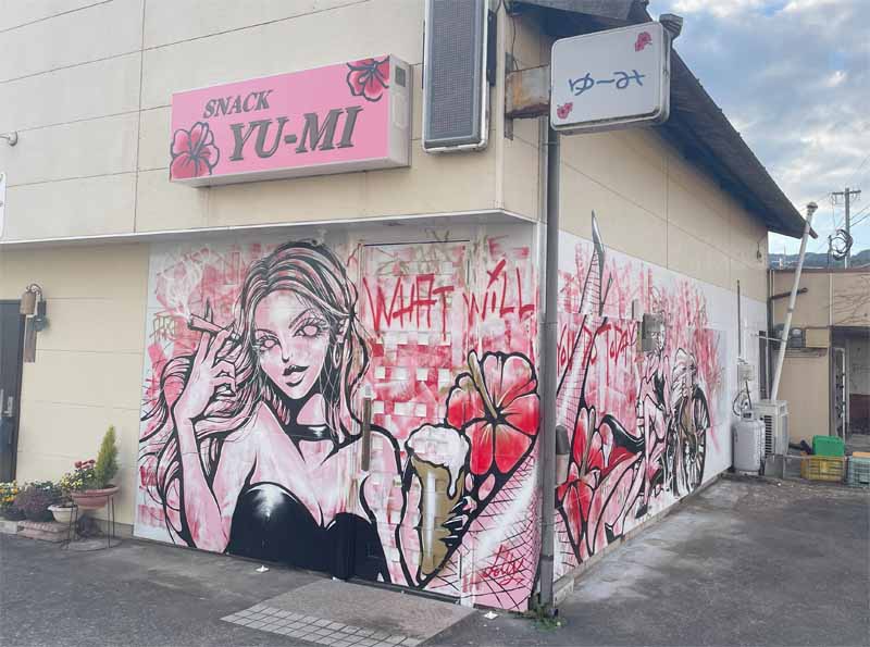 作品紹介:JR唐津線 多久駅の線路沿いにあるSNACK YU-MI(スナックゆ~み)さんの店舗にセクシーな女性が二人、店内へと誘うダイナミックな作品が完成。玄関には正面店舗ドア部までも巧みに作画していただき、横にはオーナーのご主人が愛してやまないカスタムしたハーレーを精密に表現。この作品のために看板や照明までも新設・修繕していただき、夜にも作品がご覧いただけます。また、トリックアートのように斜めから見ると作品タイトルを読むことができる。常連さんからも大変好評で作品はオーナーご夫婦からもアート制作を契機に「お店と多久をもっと盛り上げていきたい」とコメントをいただいた。