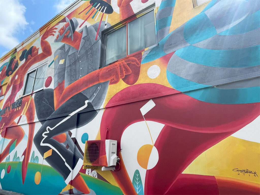 作品紹介:JR唐津線多久駅から徒歩2分。京町商店街へ向かう山犬原川にかかる中ノ橋を越えると目の前に現れる巨大壁画。現在、営業する店舗が減り寂しくなってきた商店街に「とにかく明るい作品で、まちを盛り上がるような作品を」という商店街で花屋さんを営むご夫婦からのご要望をいただき、7年ぶりに来訪となったGravityfreeさんに制作いただきました。