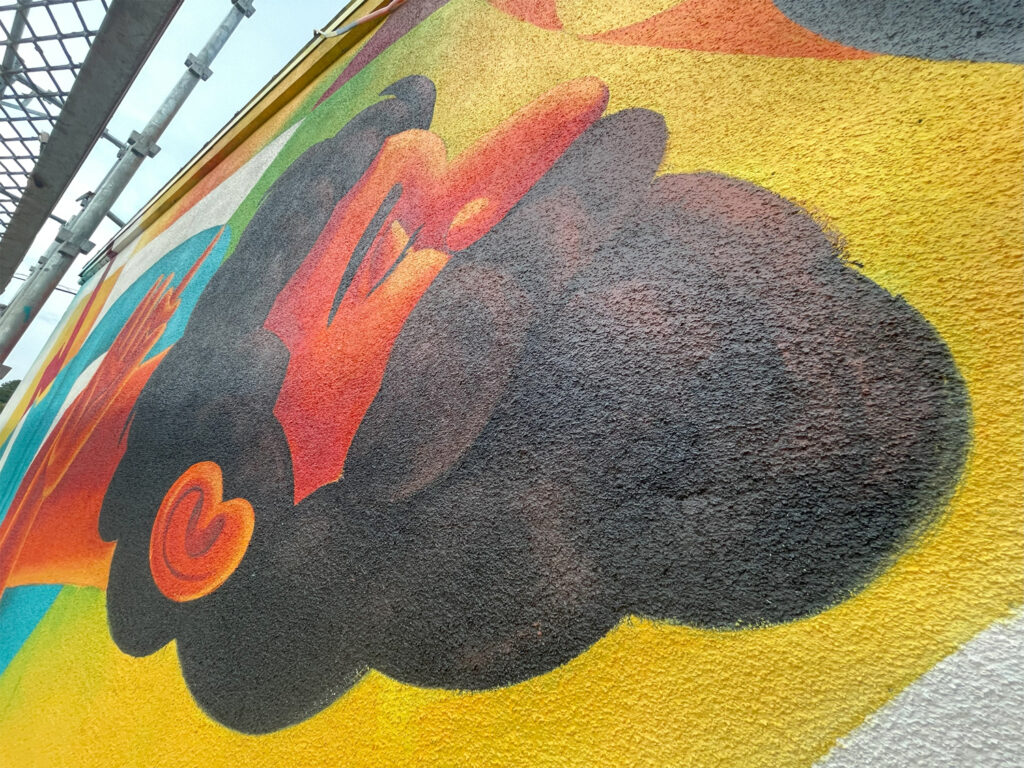 今回制作された作品は本プロジェクトでも初となる2階建ての建物の全面での制作となり、お二人にとっても、ユニット単独の作品としては最大規模の作品。