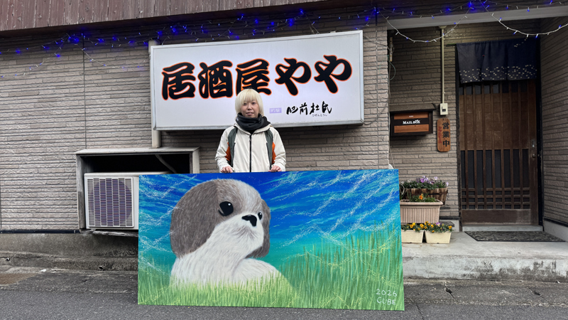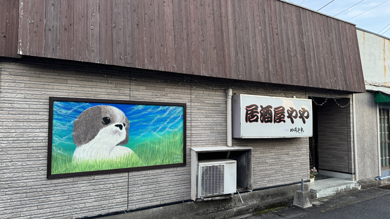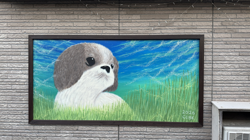居酒屋ややのオーナーさんが長年家族のように過ごし、常連客からも愛されてきたハッピーくん。数年に残念ながらお別れしたものの、今でも常連さんから愛される「ハッピー」くんを描いてほしいということで、アクリルを中心に近年は壁画制作にも力を入れているCUBEさんにお越しいただき制作していただきました。