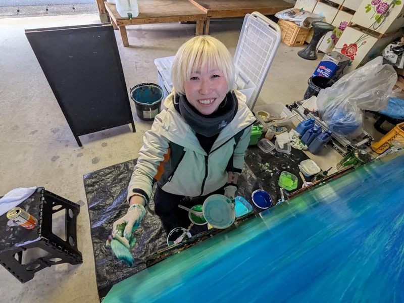 今回は壁に直接ではなく、アルミ複合版という看板によく用いられる板面への制作となったため、都通りの皆さんにもご協力いただき、都通り朝市会場でもある倉庫をお借りし、制作いただきました。